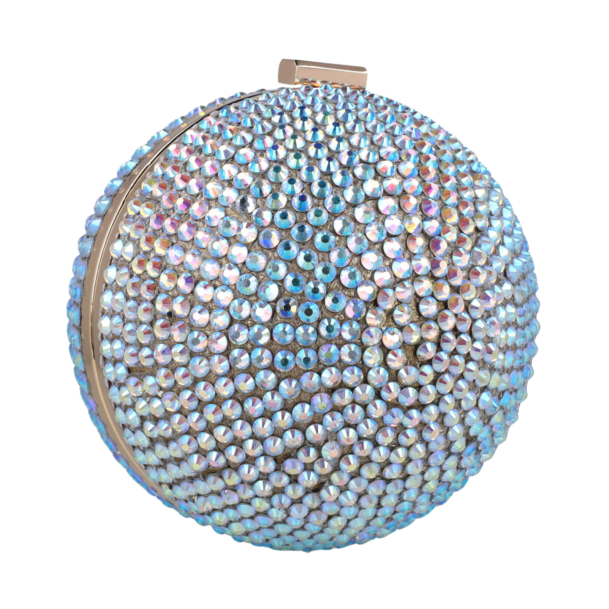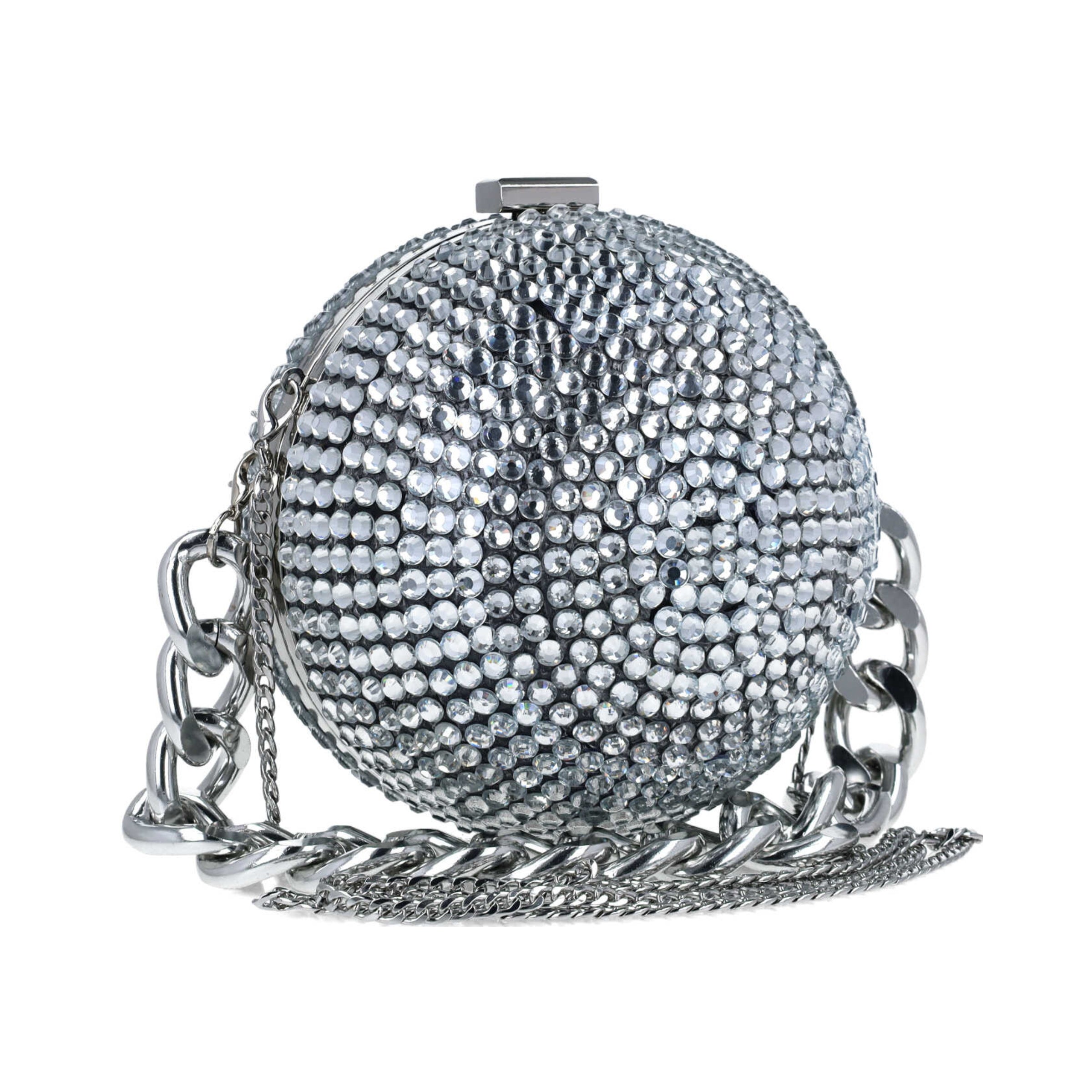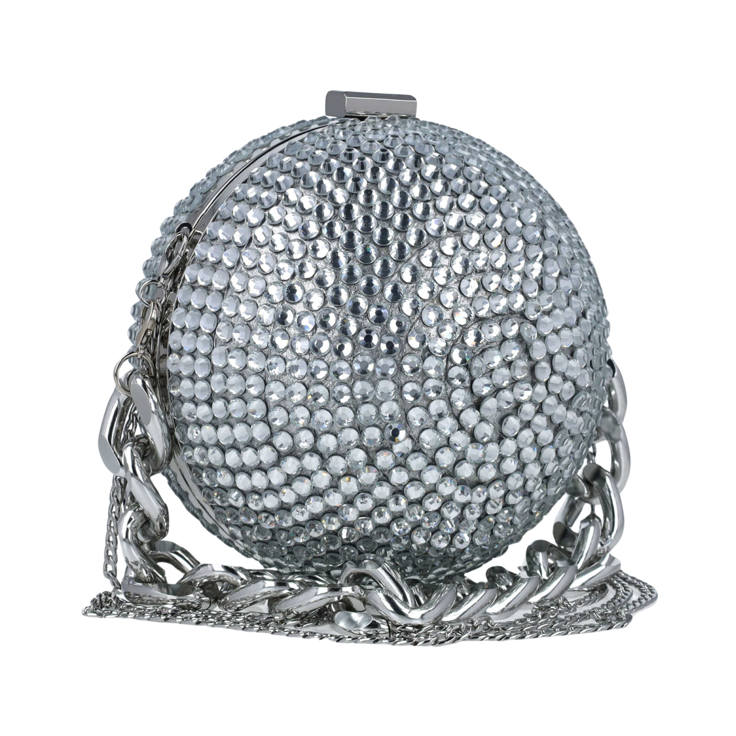 A circular evening handbag adorned with full crystal embellishment and a polished metal frame, Libitina 16 MB12 offers a compact hard-case silhouette sized for essentials. A top clasp secures the contents while the detachable chain strap provides elegant shoulder or crossbody carry.