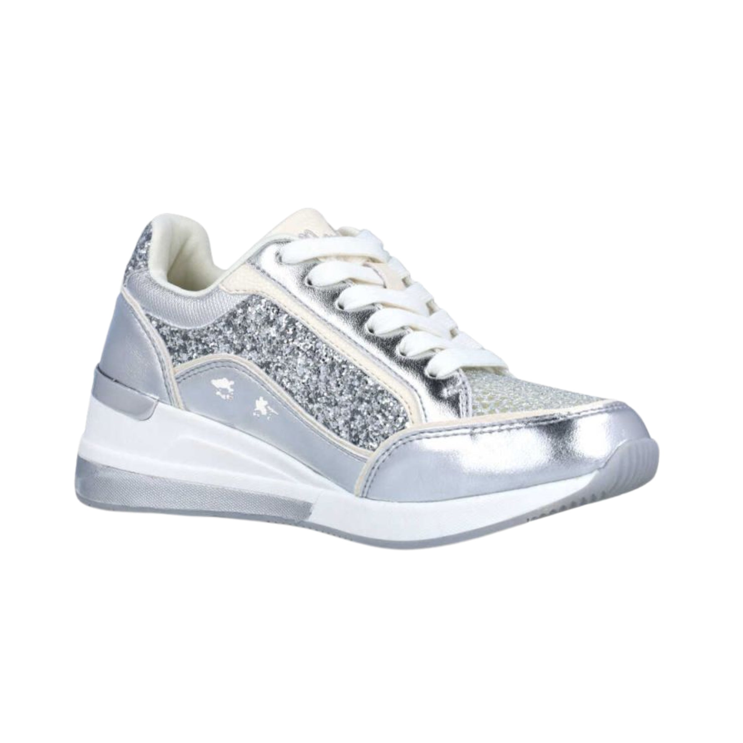 A contemporary glitter sneaker from Menbur, Loki MS1 blends sporty comfort with a refined metallic finish. The cushioned platform balances a 4.5 cm heel with a 2.0 cm forefoot for smooth lift, while mixed-material panels and breathable lining make it ideal for polished casual looks and all-day wear.