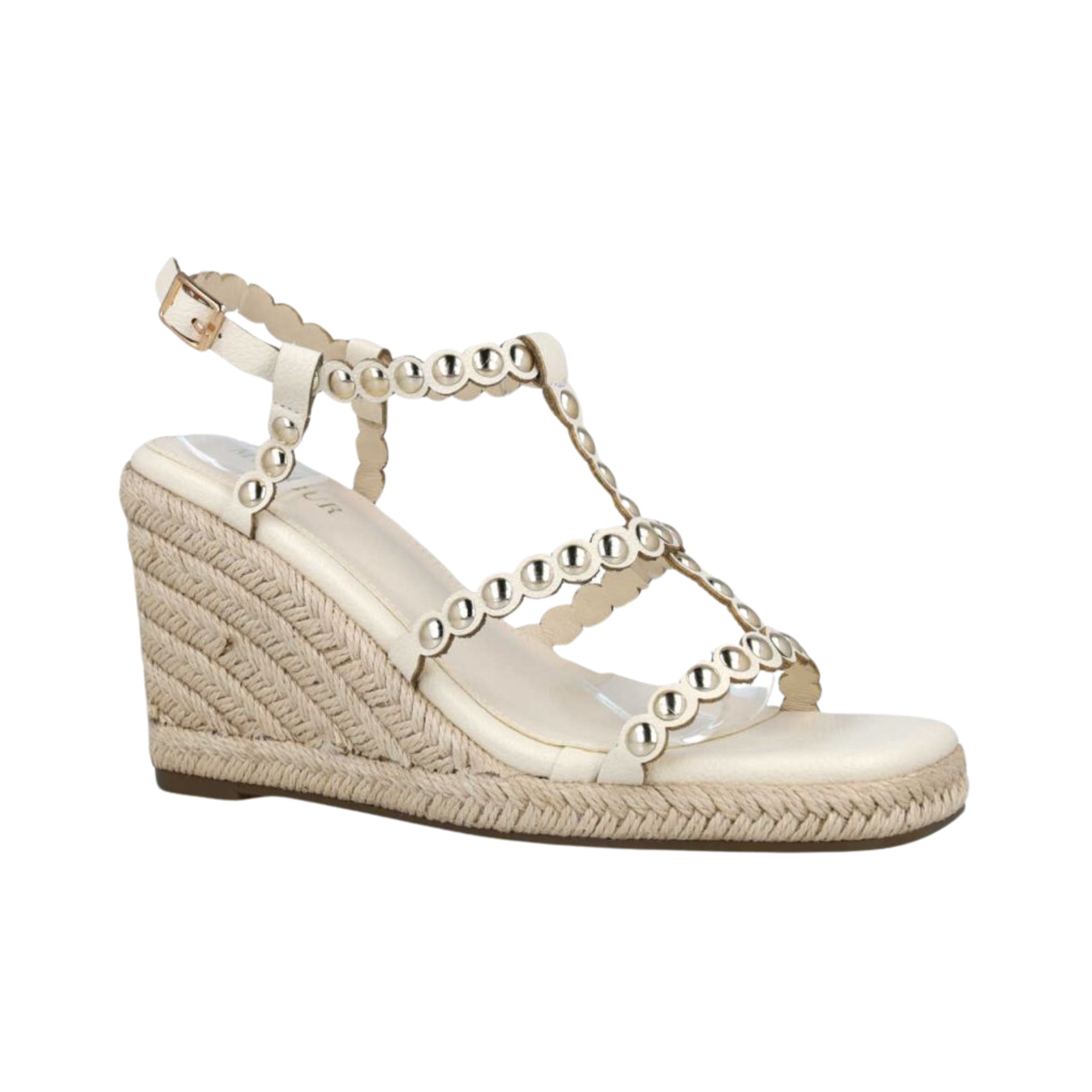 | Style | Raffia wedge sandal, peep toe, jeweled T-bar |