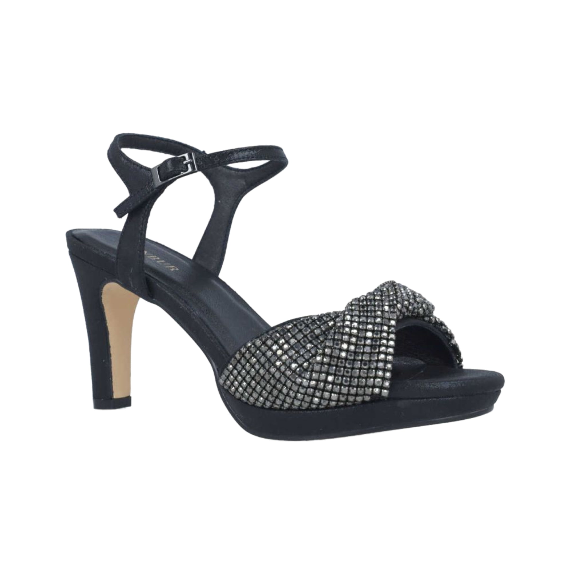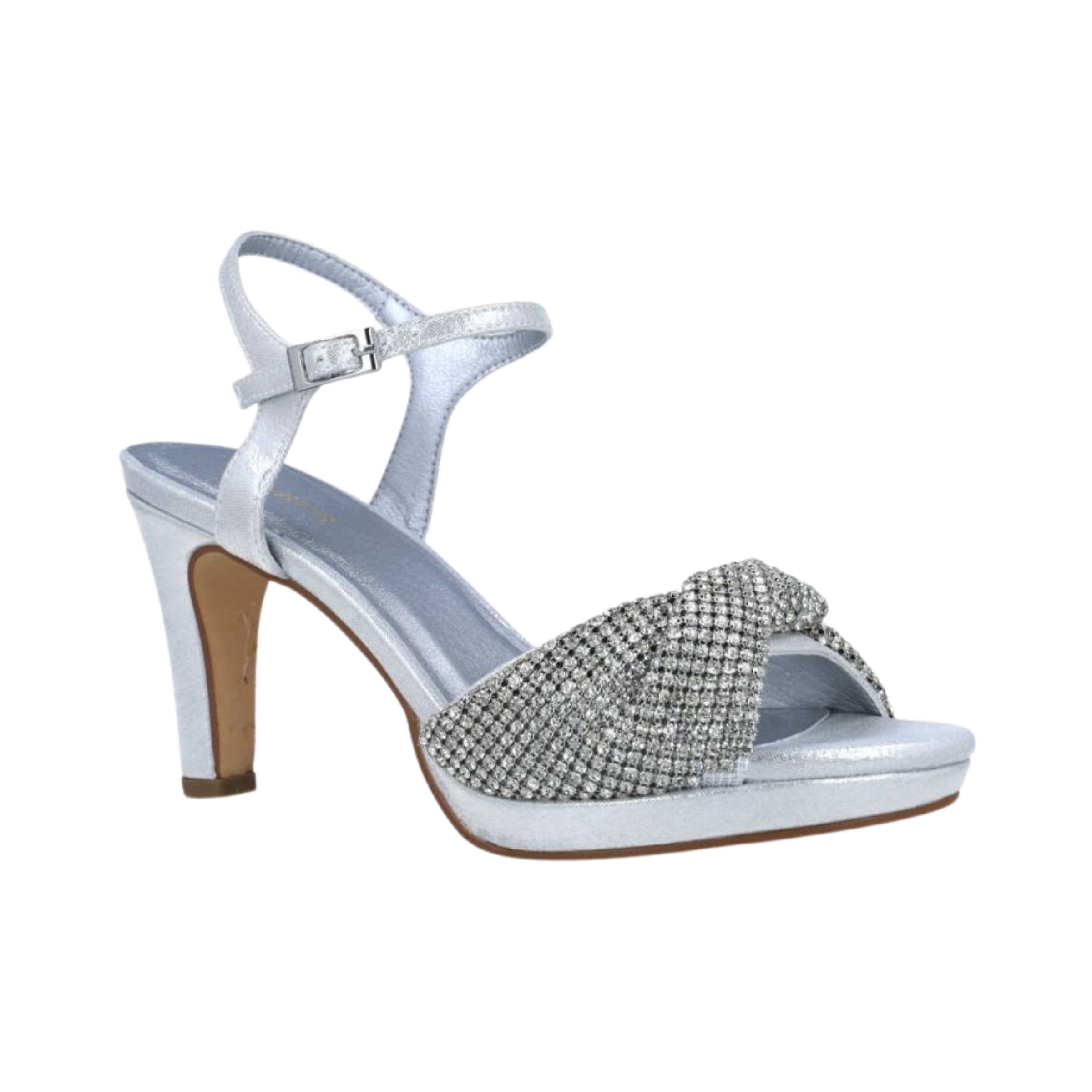 A polished mid-heel sandal from Menbur, Lucina MM52 features a crystal-studded diamante knot front strap, slim ankle buckle, and open toe for refined occasion style. The 7.0 cm heel is balanced by a 1.0 cm platform and a cushioned footbed, providing comfortable lift for weddings, events, and elegant evening looks.