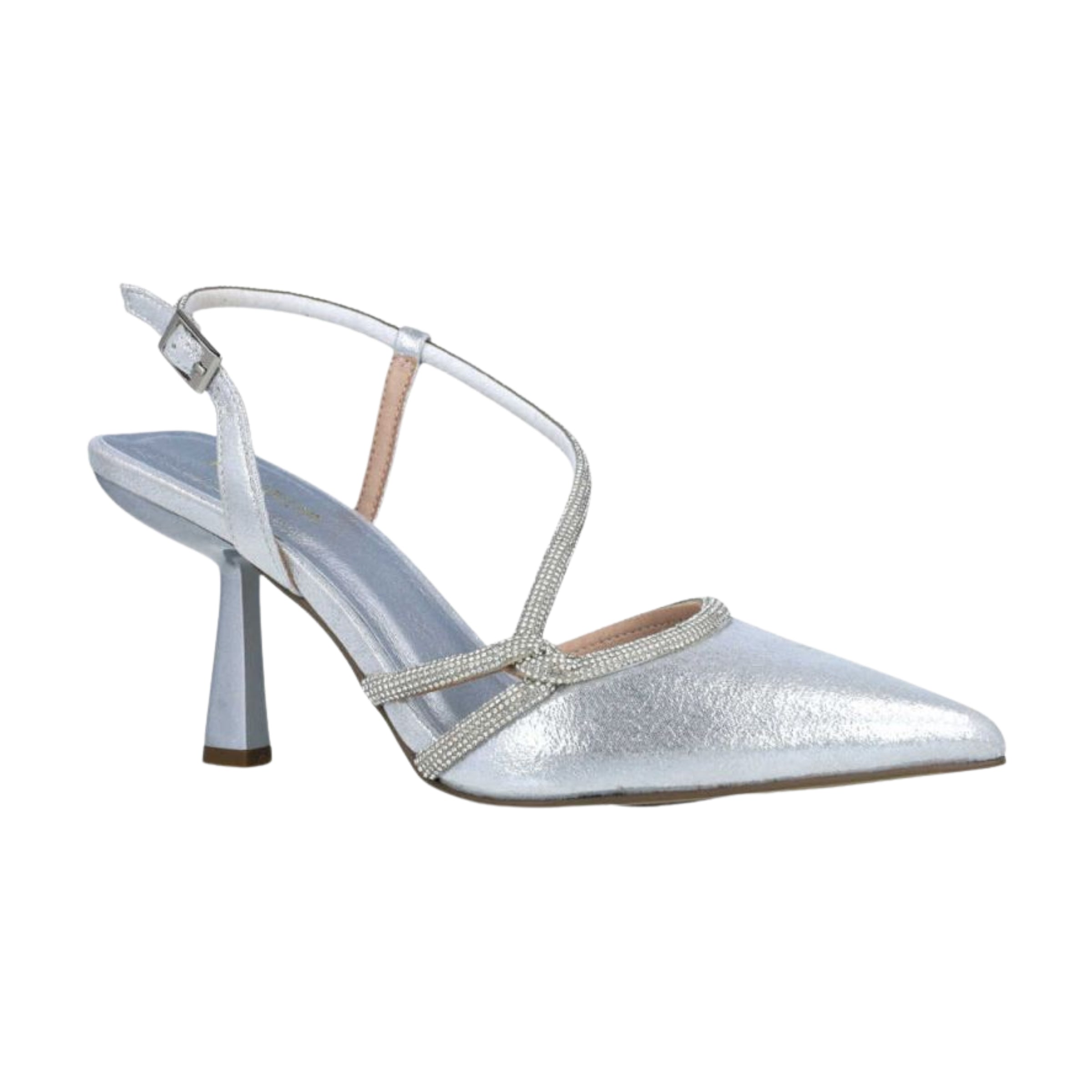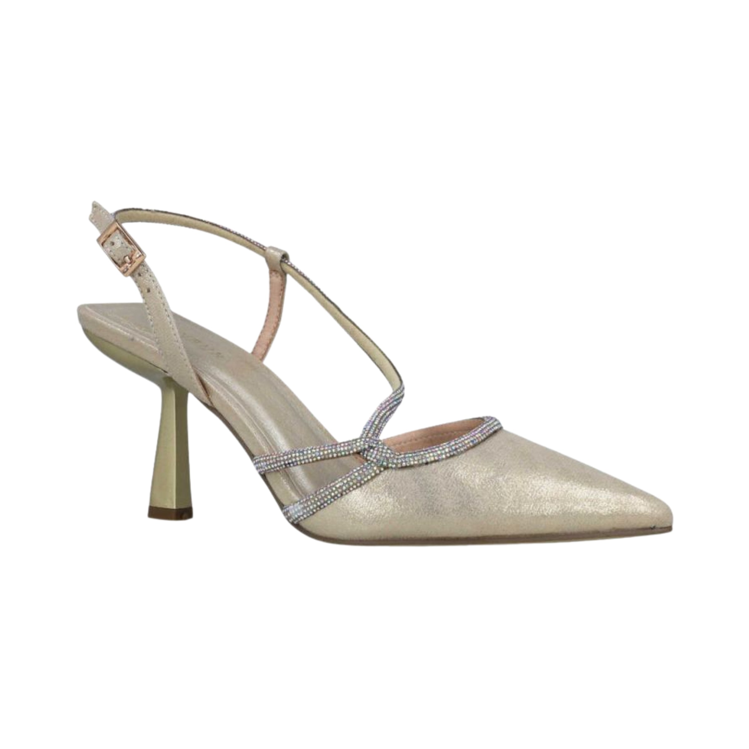A mid-heel slingback with a metallic painted finish, Morta MM21 features slim crossover straps, a pointed toe, and a sculpted 6.5 cm heel for polished height with balanced comfort. The adjustable buckle ensures a secure fit for dress occasions.