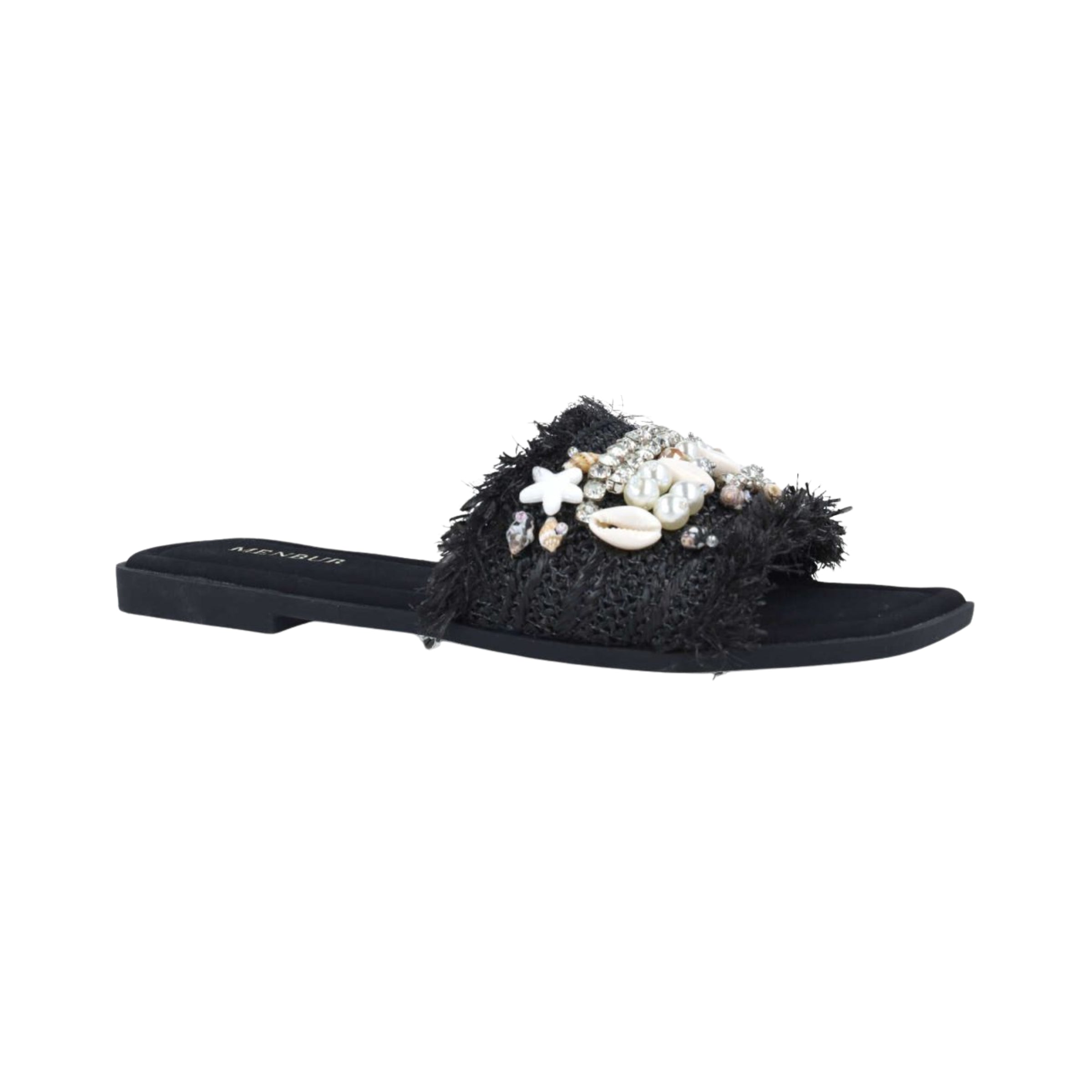 An embellished slide sandal with a squared front, Ohthere MSA24 features a woven upper detailed with floral stones and soft fringe. The cushioned footbed and low 1.0 cm heel deliver easy slip-on comfort, while the textured outsole adds casual, summer-ready traction.