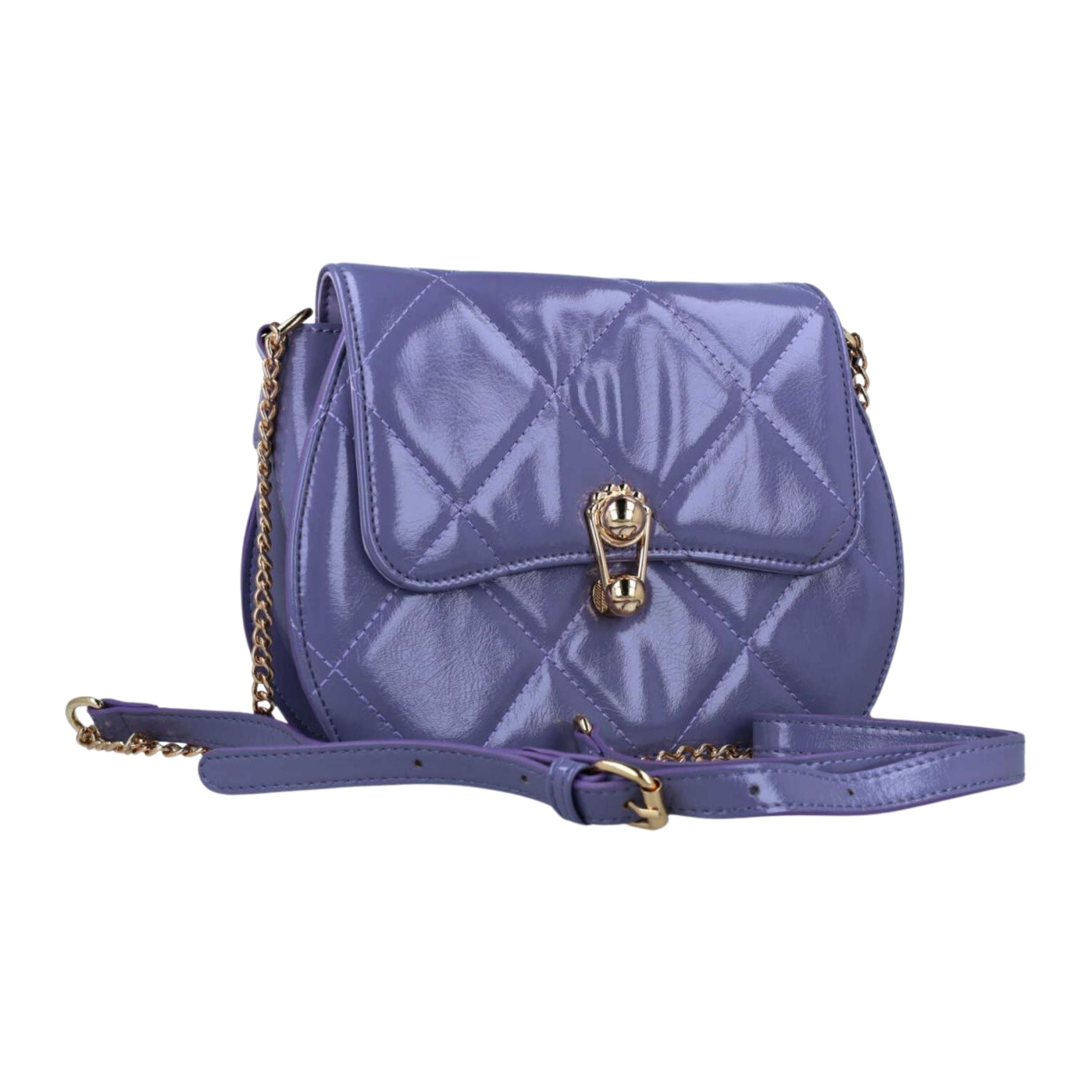 A compact patent-finish handbag with a quilted body, structured flap, and polished metal hardware. The Sculptor MB54 offers a refined silhouette sized for essentials, with an elegant chain-strap carry and secure closure for day to evening versatility.