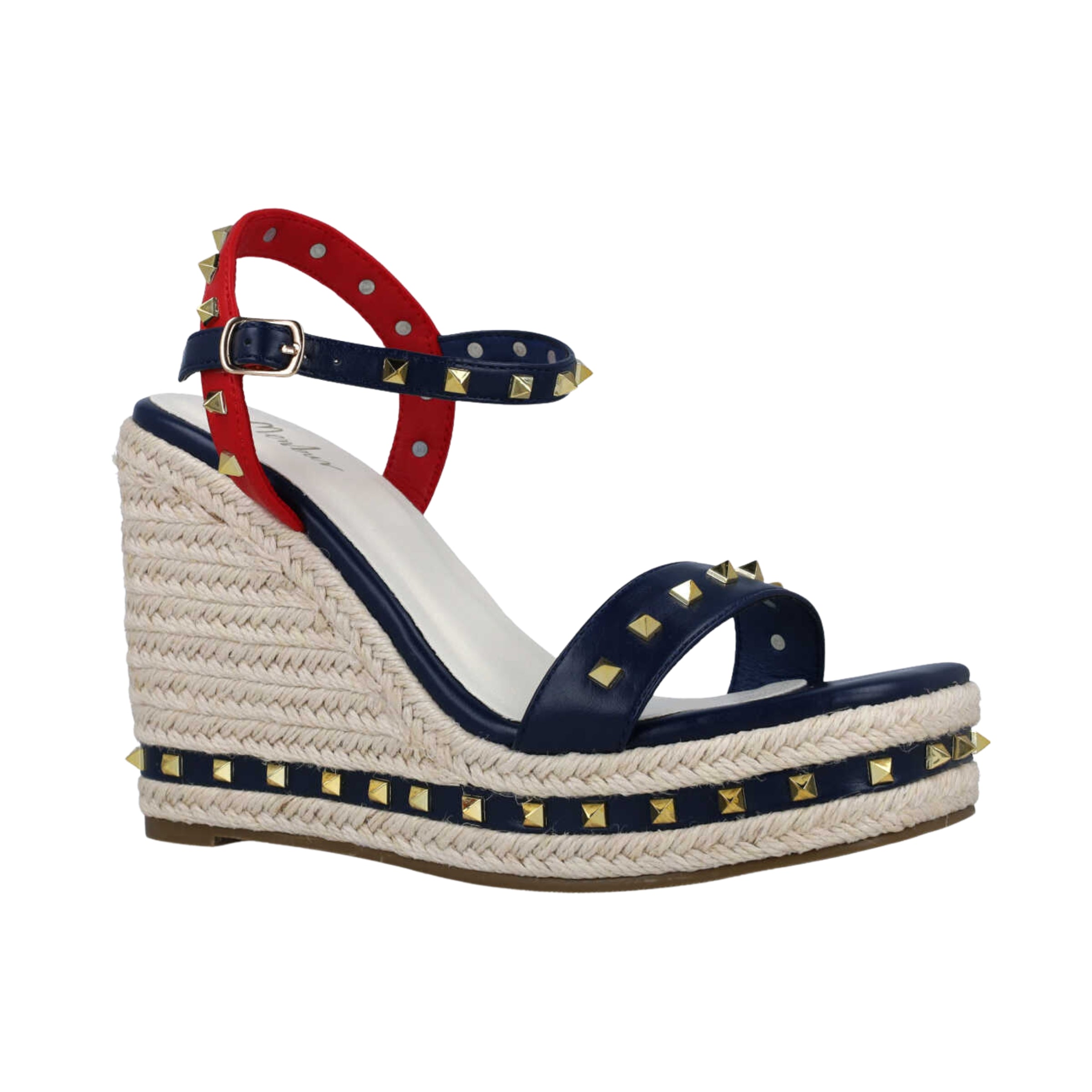 A bold wedge sandal featuring stud-detailed straps and an espadrille-inspired platform, Somnus MW1 delivers confident lift with an 11.0 cm heel and a 3.5 cm platform for balanced comfort. The adjustable ankle strap secures the foot, while the cushioned footbed and textured outsole support day-to-evening wear.
