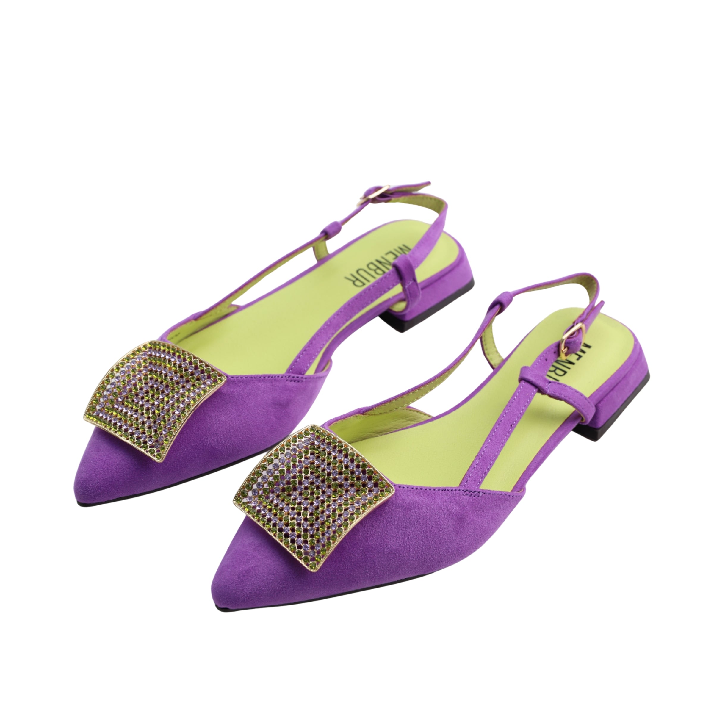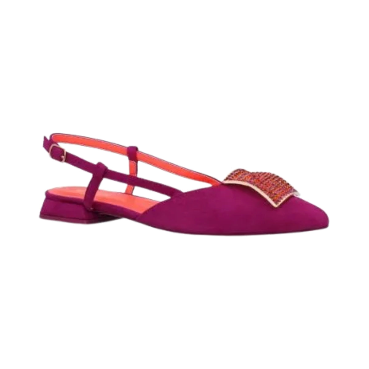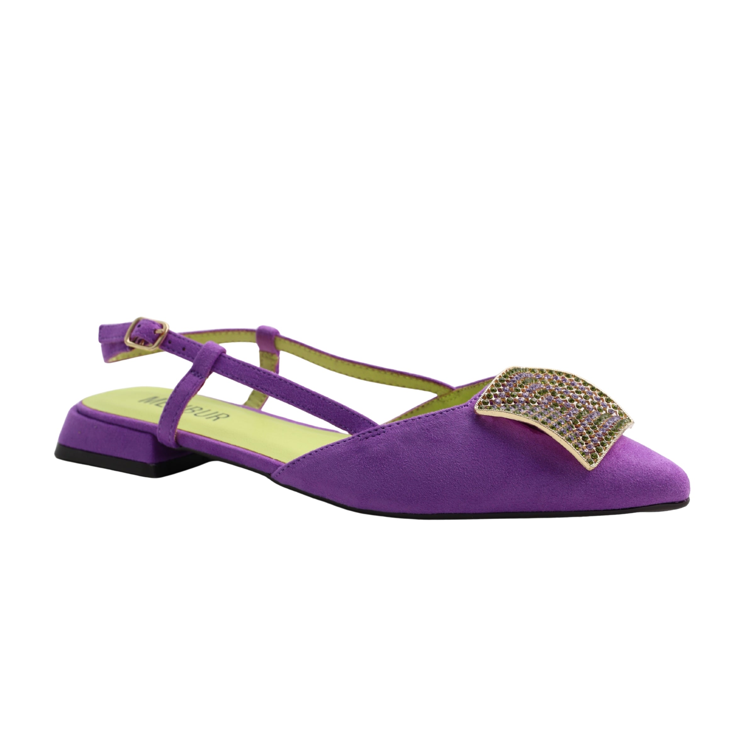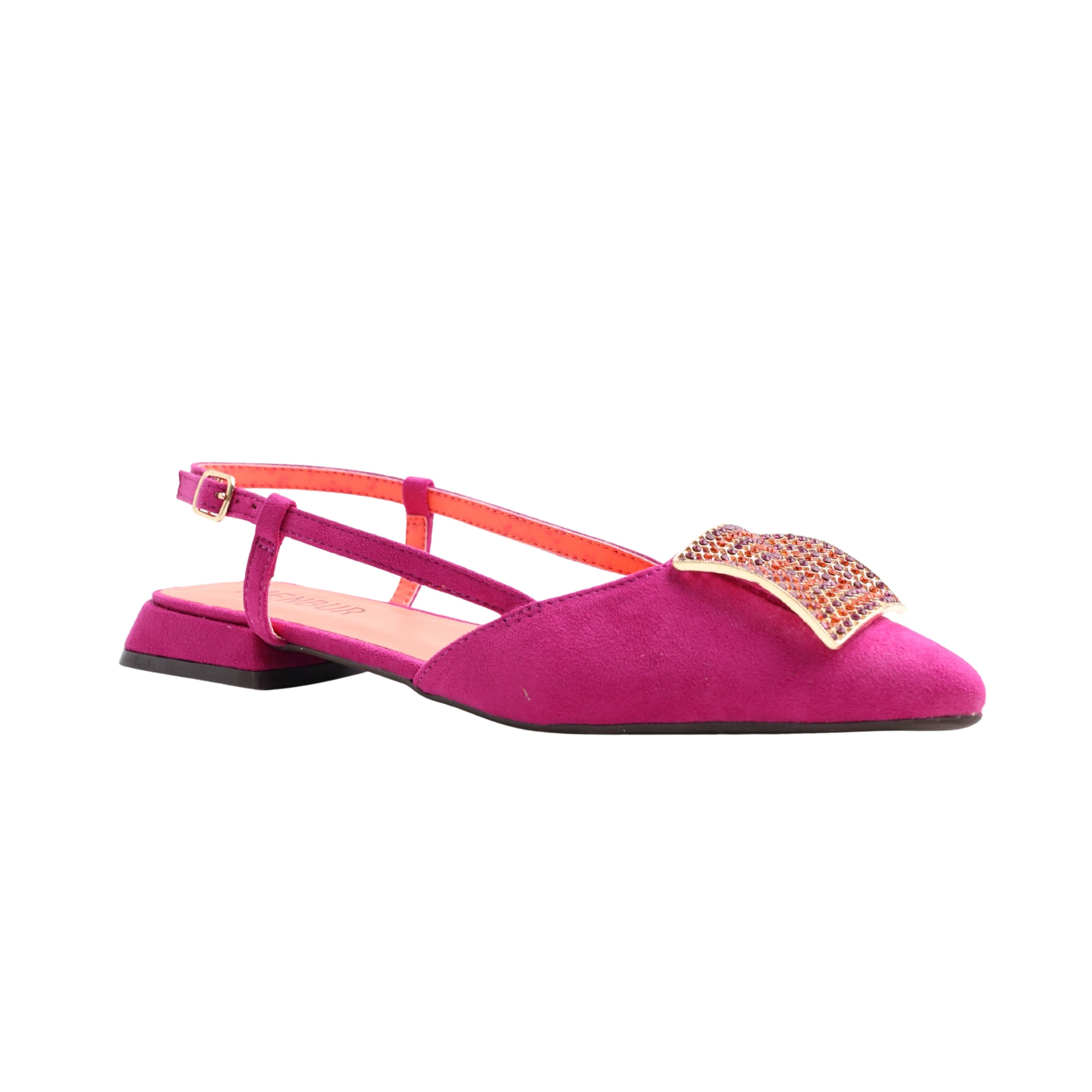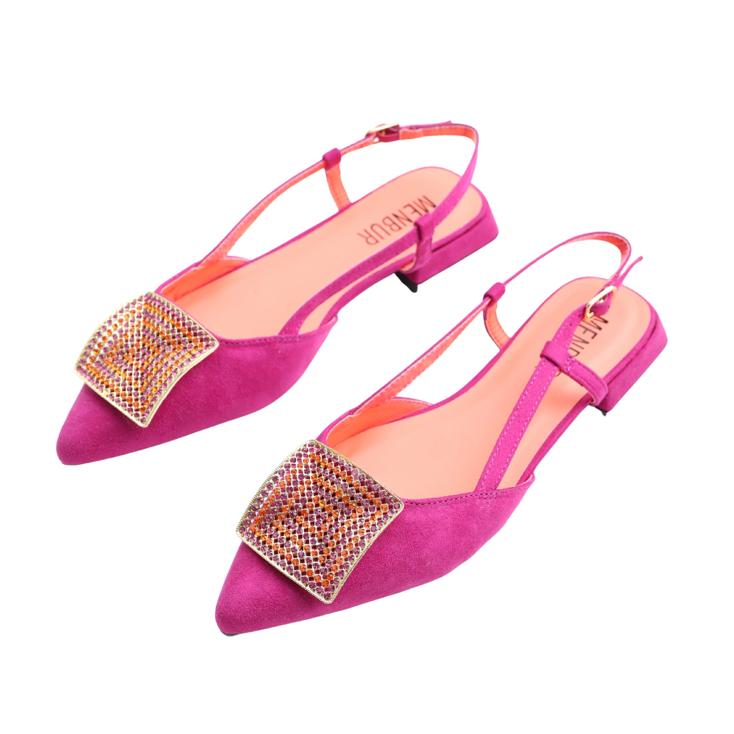 A modern flat mule from Menbur, Volva MF2 pairs a pointed toe with a sparkling vamp detail and slim contrast slingback straps for a refined, easy-on silhouette. The low 2.0 cm heel and cushioned insole offer gentle lift and day-long comfort, ideal for polished summer looks and occasion-ready outfits.