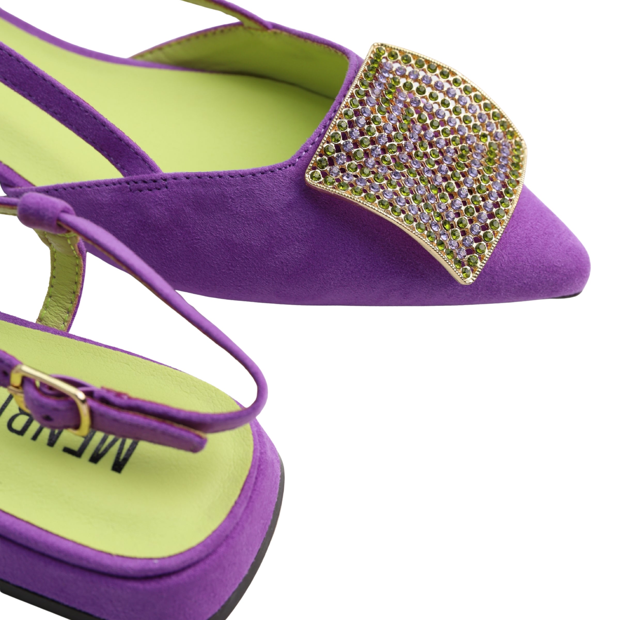 | Style | Pointed-toe flat mule with slingback and embellished vamp |